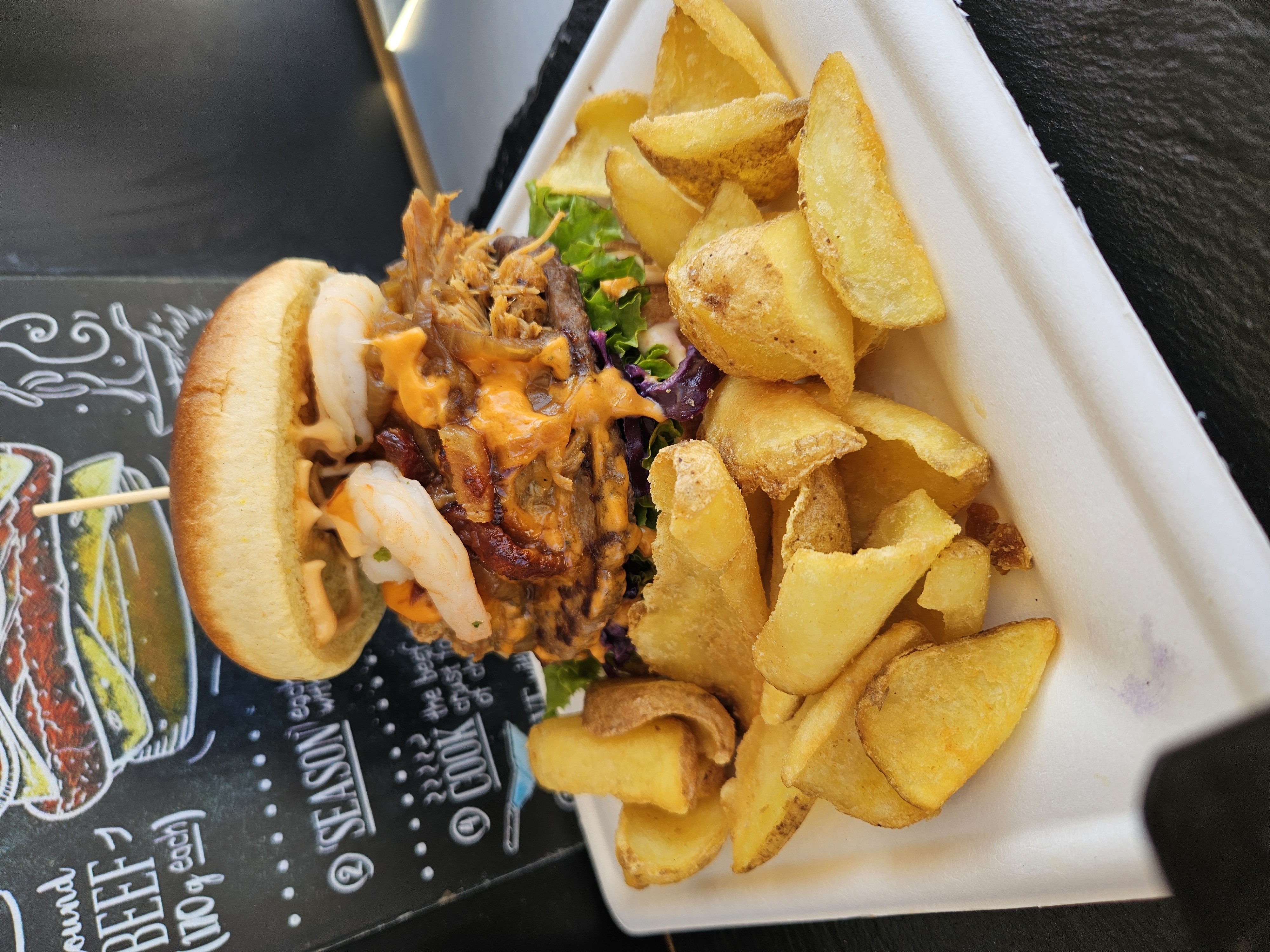 Schweinerei: Schweinerei: Pulled Pork, Coleslaw, Special Sauce, Garnelen, Bacon Whisky, Karamellisierte Zwiebel, Käse Sauce, Burger Brötchen,