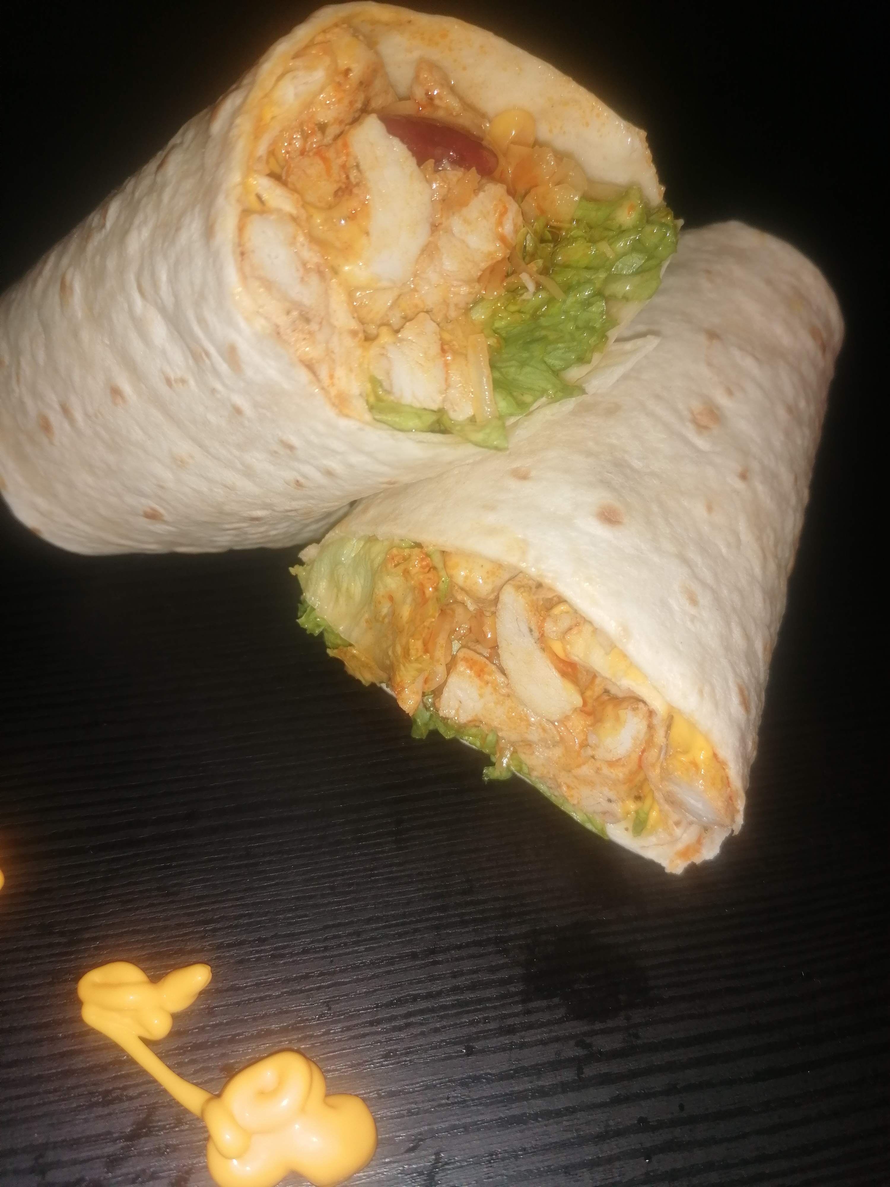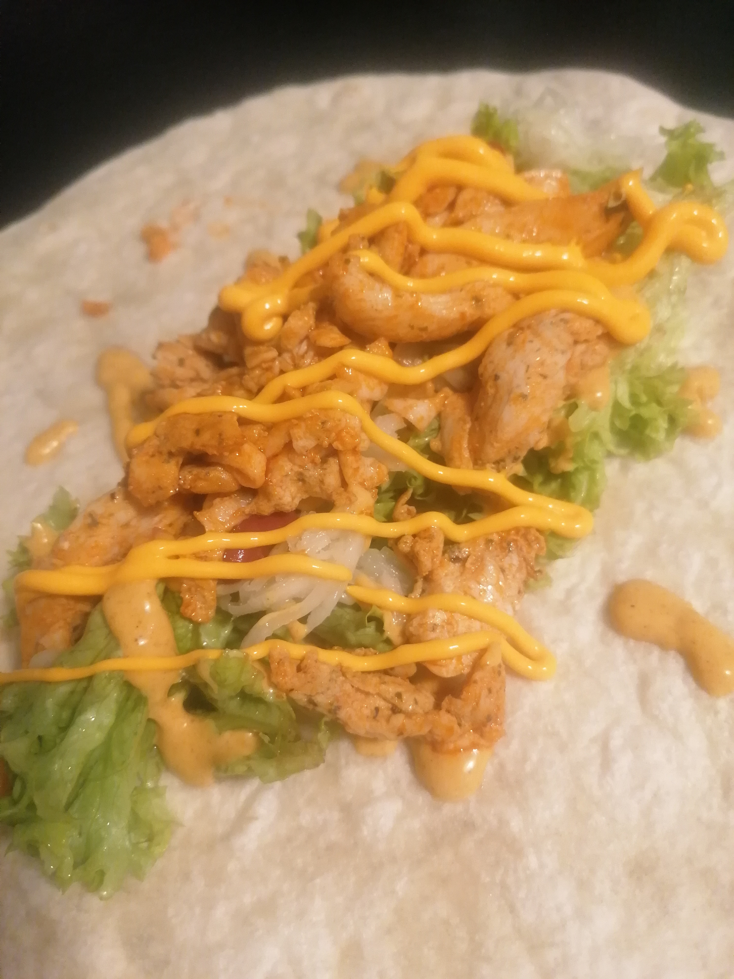 Ohne Fleisch: 30 cm Tortilla, Sojastreifen vom Grill, Krautsalat,Mango-Curry-Sauce, Reis,Ananasstückchen