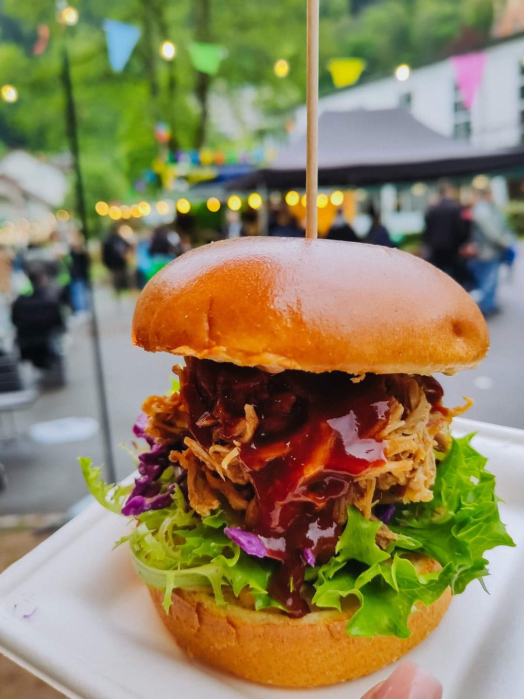Geile Sau: Pulled Pork aus dem Smoker,Coleslaw, Salat,Special Sauce,Bacon Whisky, karamellisierte Zwiebel, Burger Brötchen