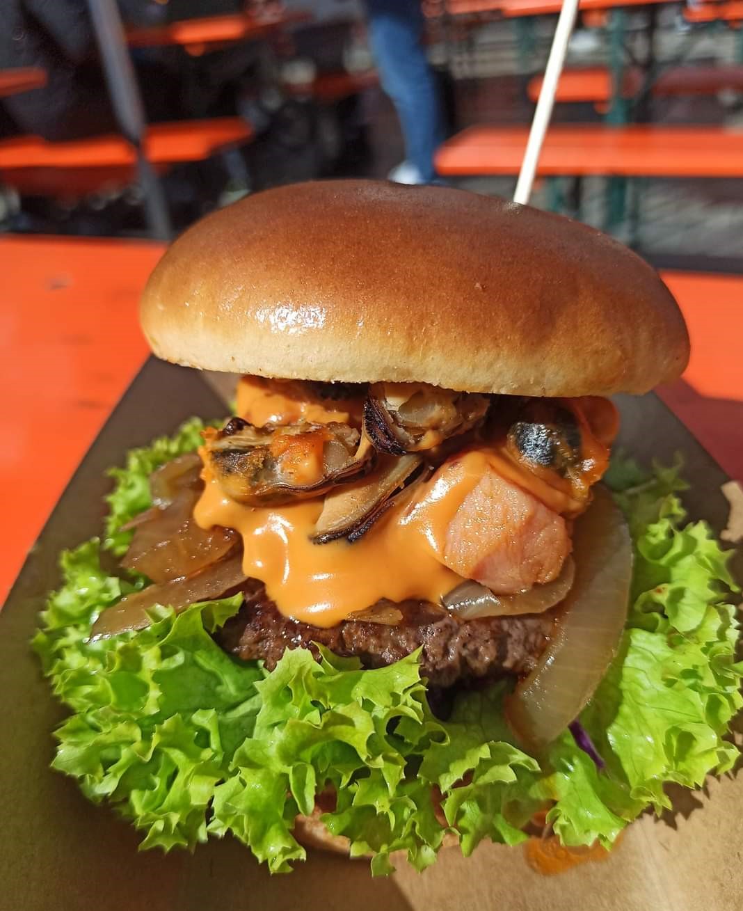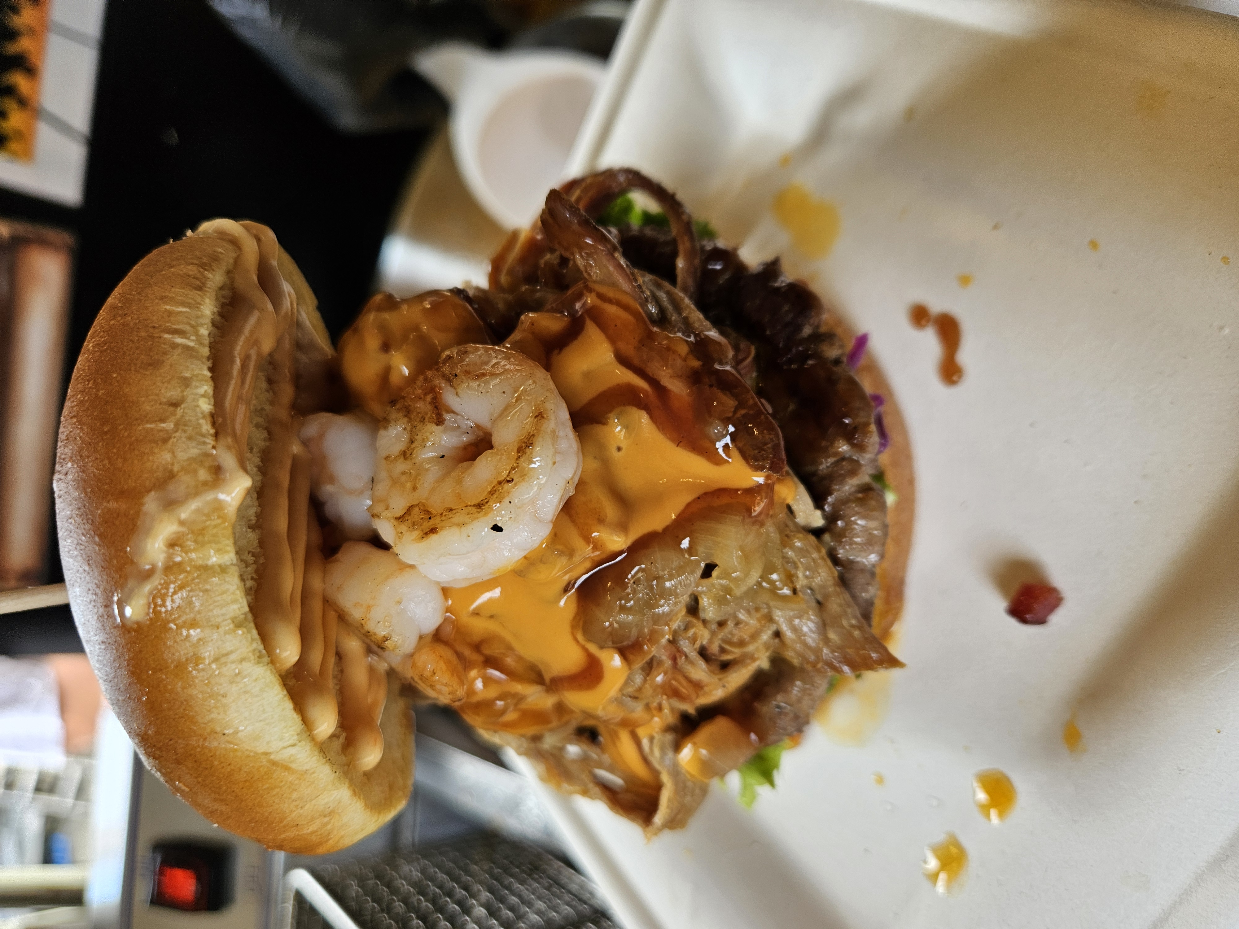 Surf&Turf: reines Rindfleisch-Patty, knackiger Salat, Coleslaw, Garnelen, Special-Sauce, karamellisierte Zwiebel,Käse-Sauce, Burger Brötchen